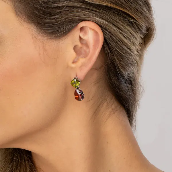 Brinco Banho Ródio Zircônias Amarela Quadrada E Gota Vermelha